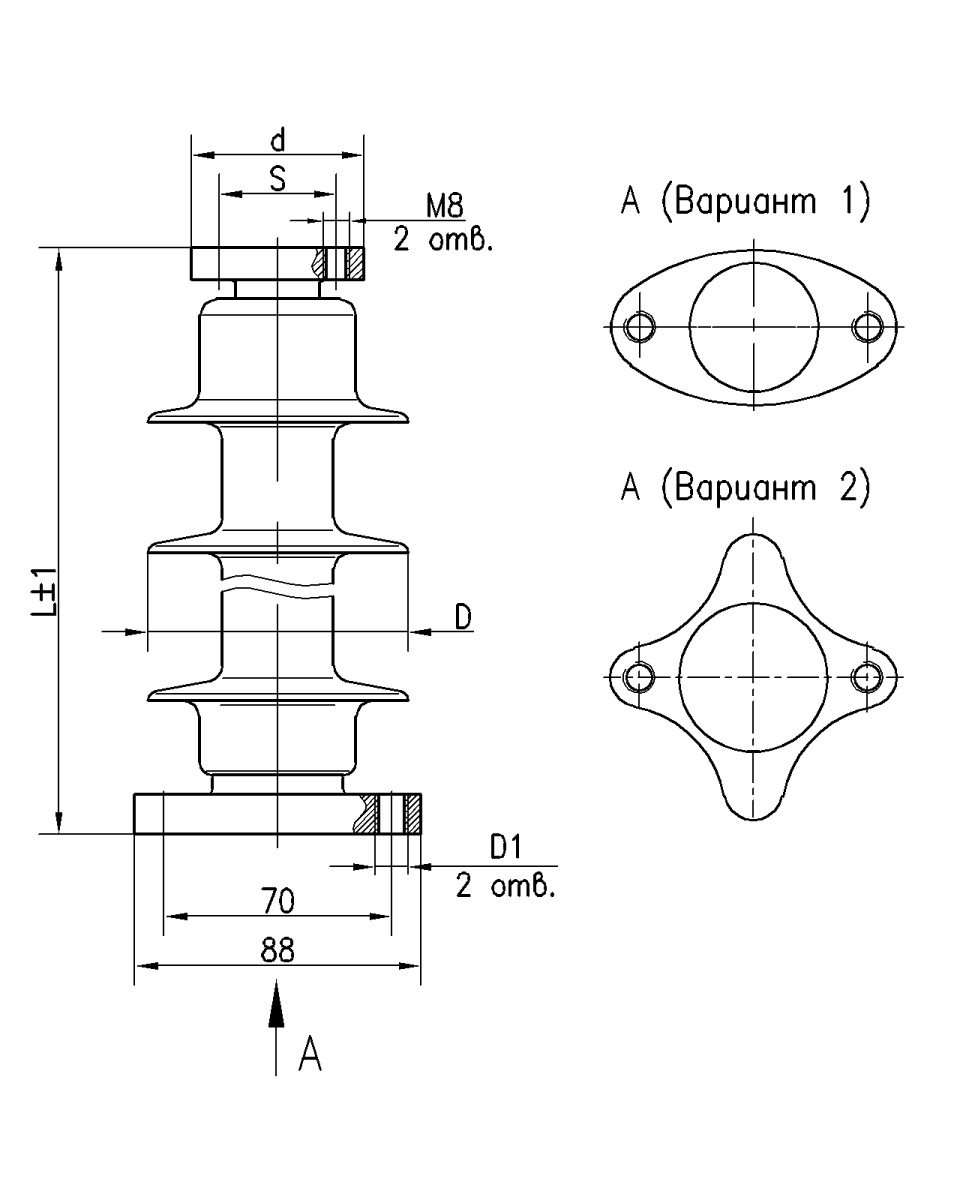 Outdoor support rod polymer insulators with organosilicon protective sheath of IOSK 4/10 UHL1 type are designed for insulation and fastening of live parts in electrical apparatuses, switchgears of power plants and AC substations with a voltage of up to 10 kV. As an element that absorbs mechanical loads, insulators use a high-strength fiberglass rod, which is commensurate in strength with alloyed structural steels. The highhydrophobicity of the protectivesheath made of organosilicon rubber (silicone) in almost any conditions of contaminationensures low leakage currents (1 – 2 orders of magnitude lower than that of porcelain insulators), which, in turn, increases the discharge characteristics and has a positive effect on energy saving.The insulator has several modifications in terms of construction height, length of leakage path and dimensions of fastening holes in the flanges.