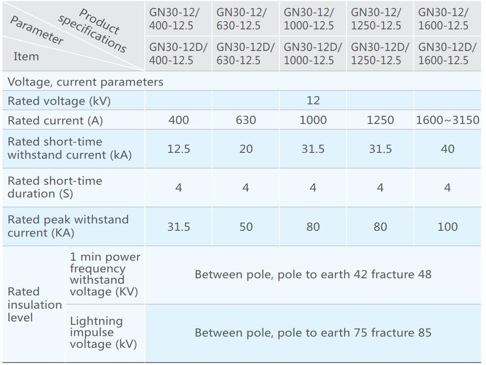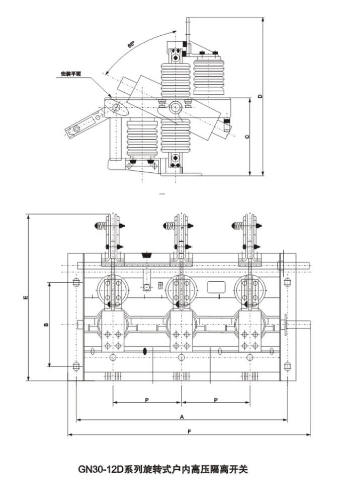 GN30-12 (D) type rotary indoor high-voltage disconnect switch is a new type isolation switch of rotary knife type, the main structure is fixed two groups of insulator and contact on the two plane of three-phase chassis, through the rotary contact, realize the switch on-off. GN30-12 (D) type switch is a new type added grounding knife on the GN30-12 type switch basis, which can meet the needs of different power systems. The product design is with compact, small occupied space, strong insulating ability, easy installation and adjustment, its performance meets the GB1985-89 “AC high voltage isolating switch and the grounding switch” requirements, applicable to the rated voltage 10kV AC 50Hz and below indoor power system, to open and close the circuit when voltaged, no load. It can be used with the high voltage switch cabinet, and also can be used separately.
