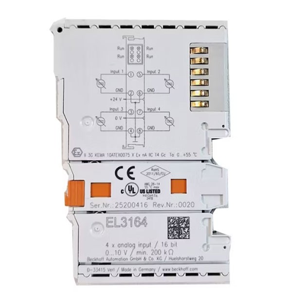 The EL3164 is a 4-channel analog input terminal produced by Beckhoff, designed for measuring analog voltages in the range of 0 to 10 V. Here are the key features and technical specifications of the EL3164 module: